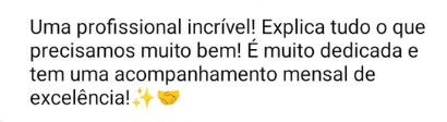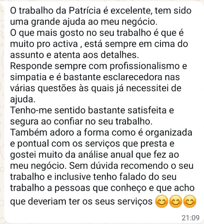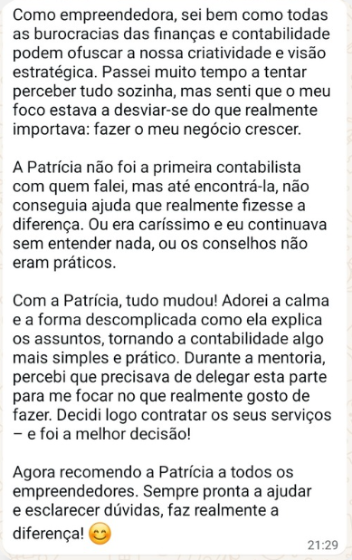 Trato da contabilidade mensal e ainda dou feedbacks do ponto de situação trimestralmente – Para estares sempre por dentro das finanças do teu negócio. O meu objetivo é ajudar as empresas a seres sustentáveis e lucrativas, e os meus clientes falam por sí!